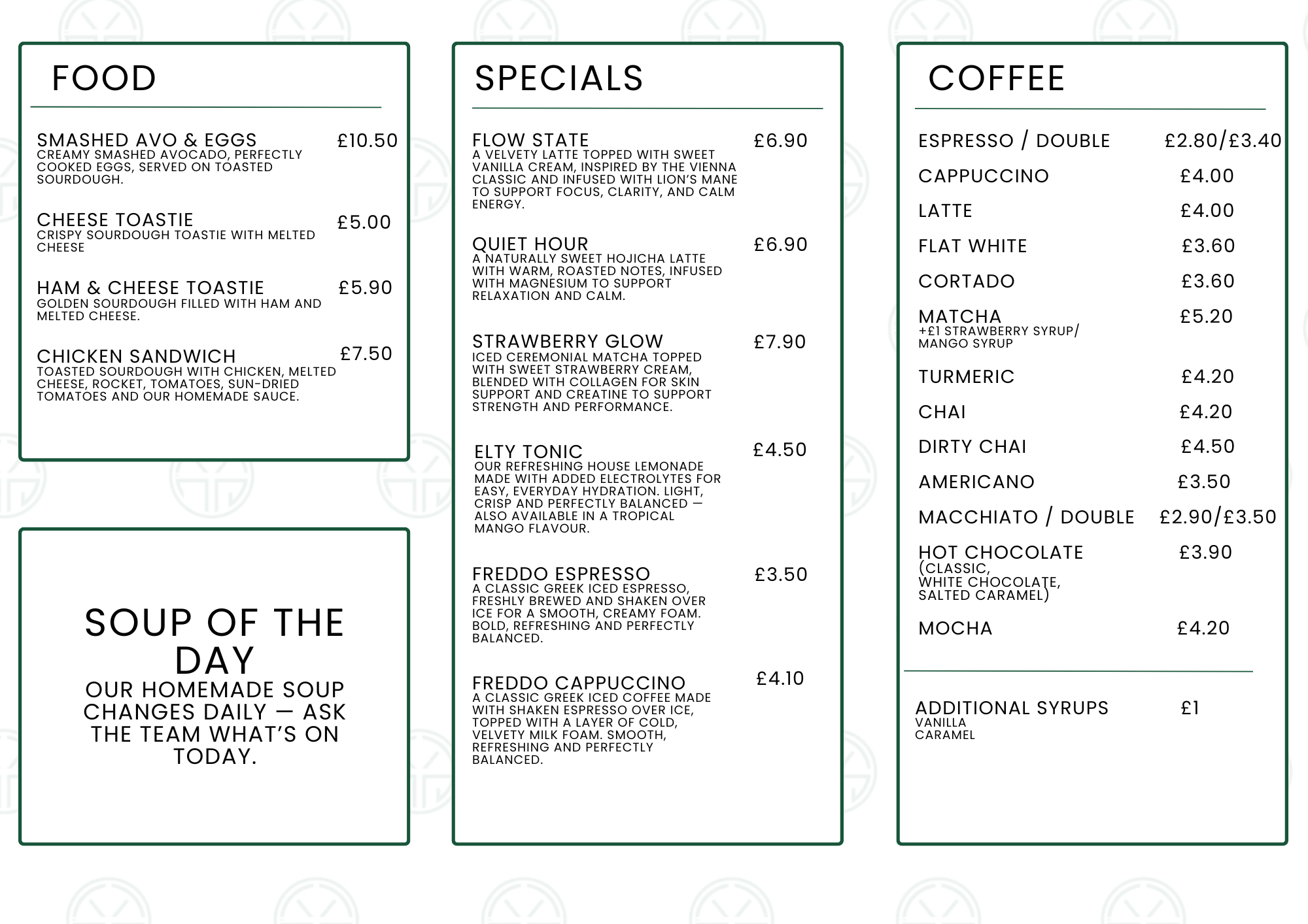 - Brain-boosting coffees, calming elixirs, and nourishing snacks, freshly baked pastries, hand-made breakfast,brunch and lunch options.
